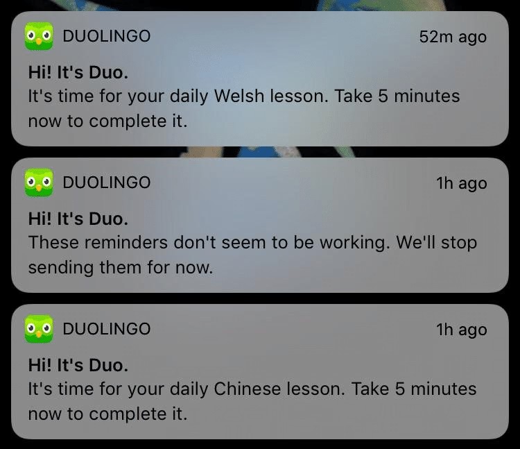 Duolingo và thông báo đẩy tạo ra cảm giác khẩn cấp để người dùng hành động.