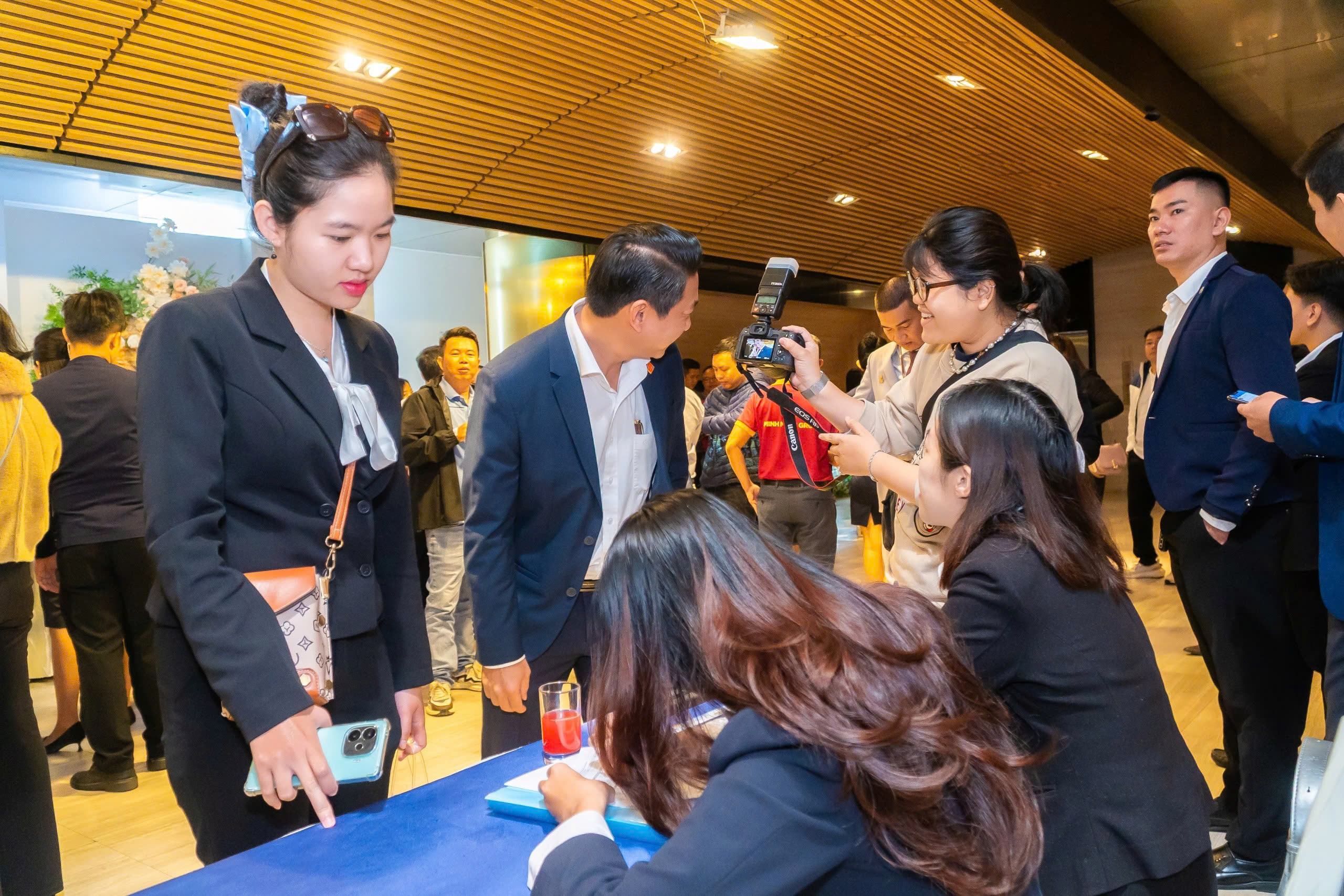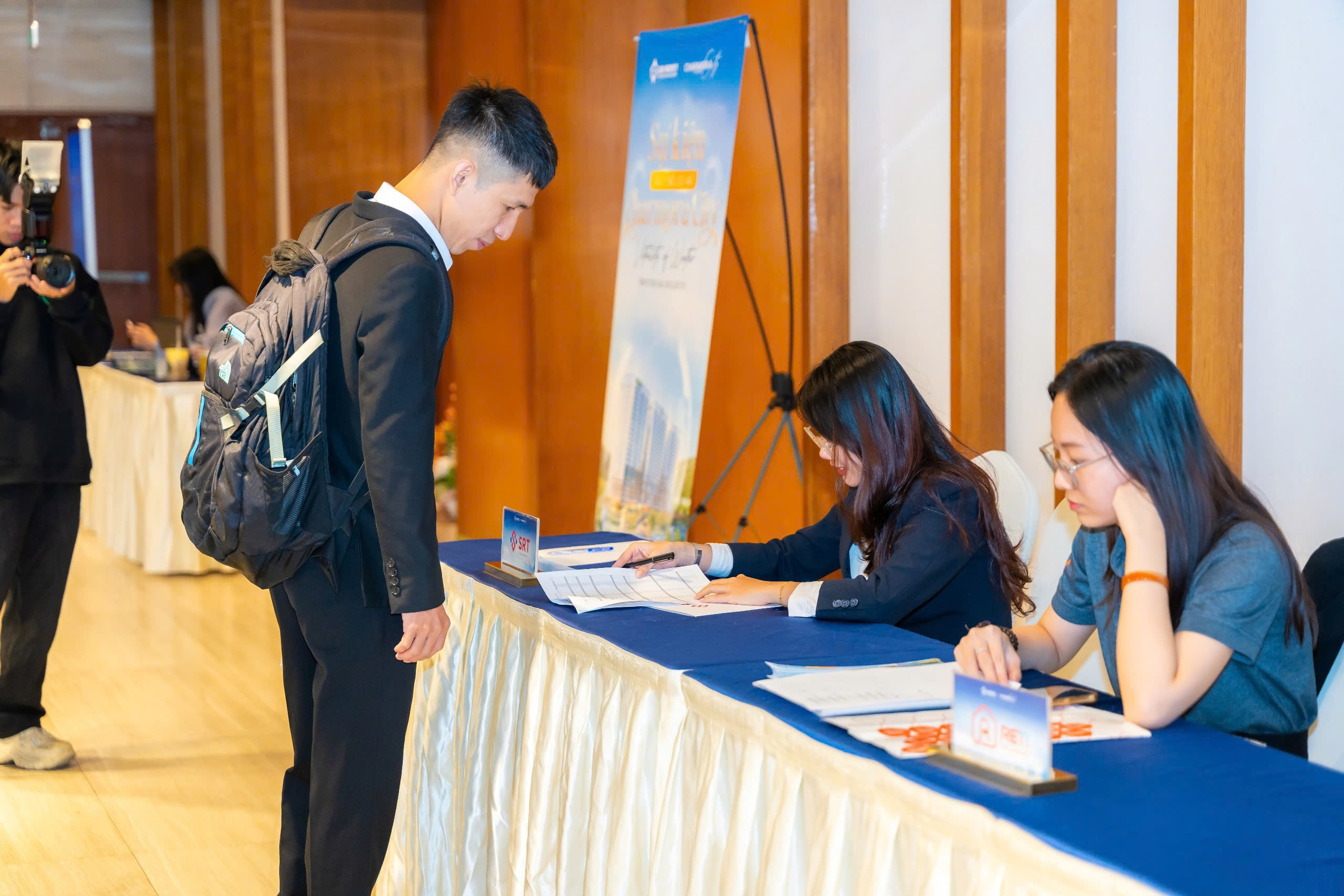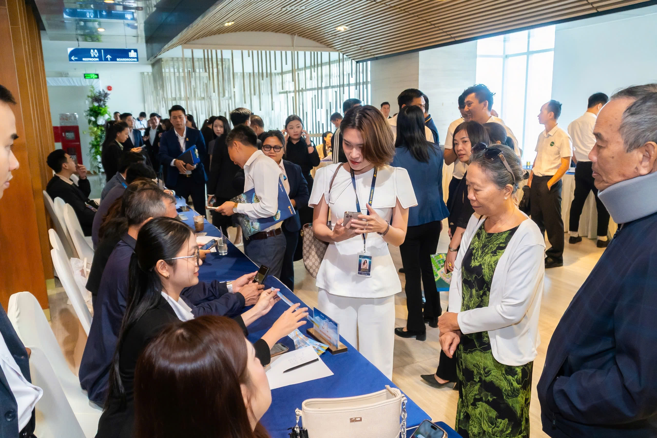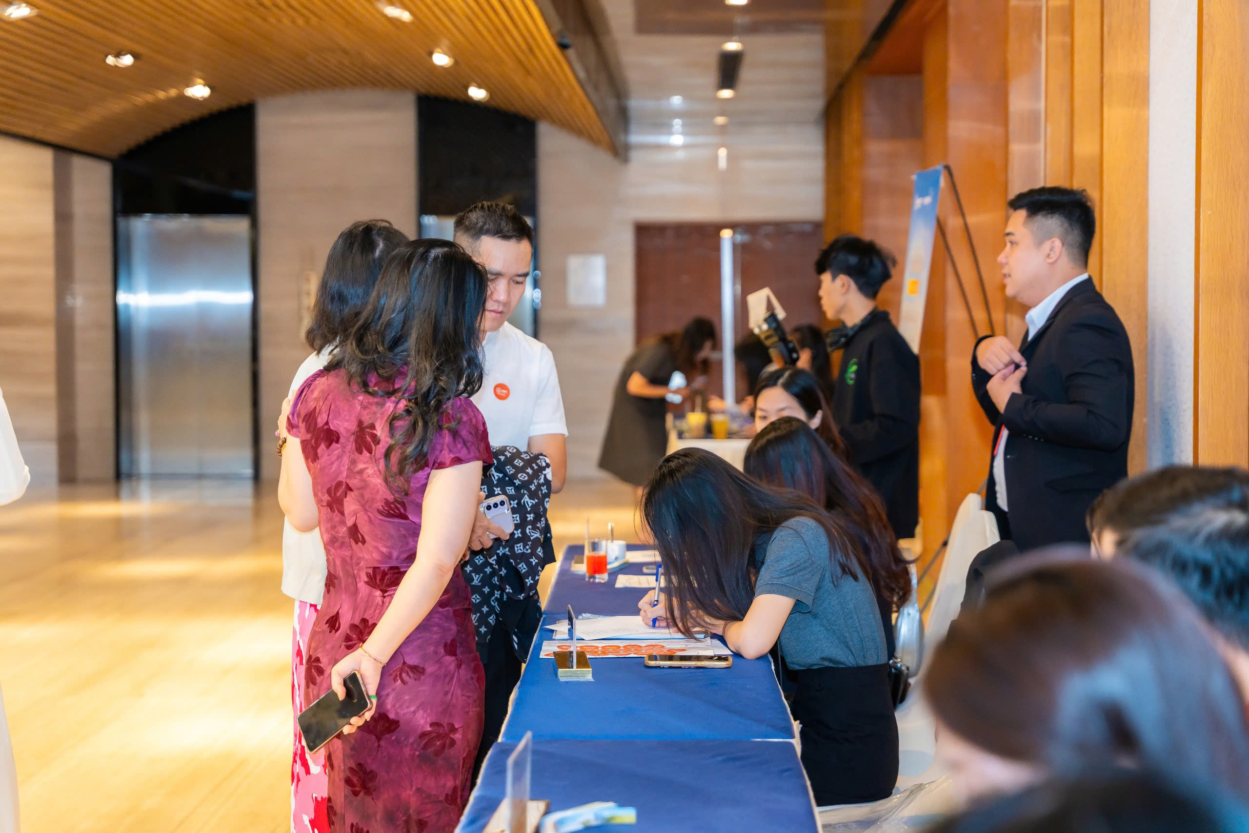 Một chương trình cao cấp cần sự “đúng tone” ngay khi khách bước vào: khu vực check-in được bố trí hợp lý để tạo trải nghiệm đón tiếp tốt; backdrop, standee, bảng chỉ dẫn đặt đúng điểm nhìn; sân khấu cân đối theo góc nhìn và truyền thông. Tất cả những điều này tạo nên một cảm giác xuyên suốt: dự án được giới thiệu bằng sự chỉn chu.