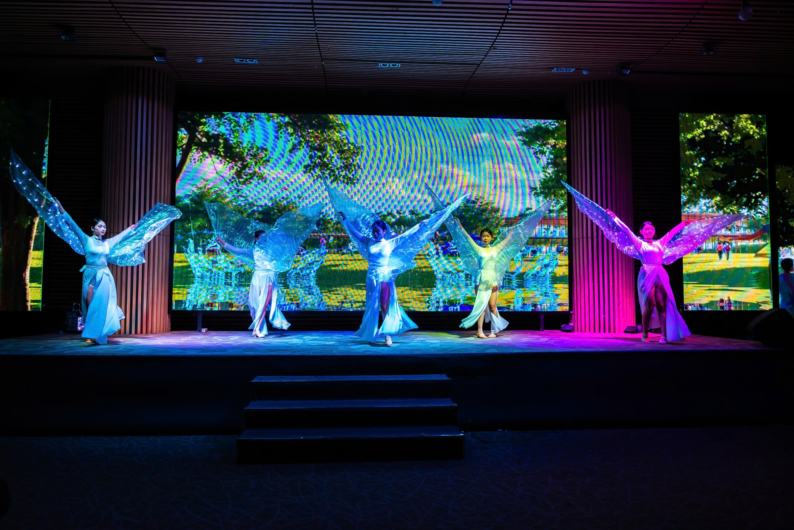 Ở tiết mục múa tương tác LED, visual tiếp tục được xử lý như một “đối tác trình diễn”, đòi hỏi vận hành chính xác theo cue để ánh sáng, chuyển động và nội dung hòa quyện, mở ra chủ đề theo cách giàu ấn tượng.