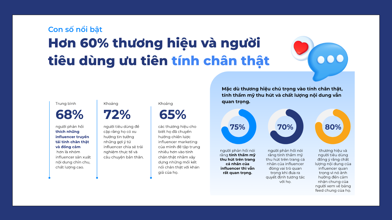 Tính chân thật là yếu tố then chốt giúp influencer xây dựng lòng tin, tăng cường tương tác và thúc đẩy chuyển đổi. Theo khảo sát, 68% người tiêu dùng ưa chuộng influencer chia sẻ nội dung chân thật, gần gũi, thay vì những nội dung quá hoàn hảo. 65% thương hiệu hiện nay tập trung vào việc hợp tác với influencer chân thật để tạo sự kết nối sâu sắc với khán giả và mang lại hiệu quả cao trong chiến dịch.