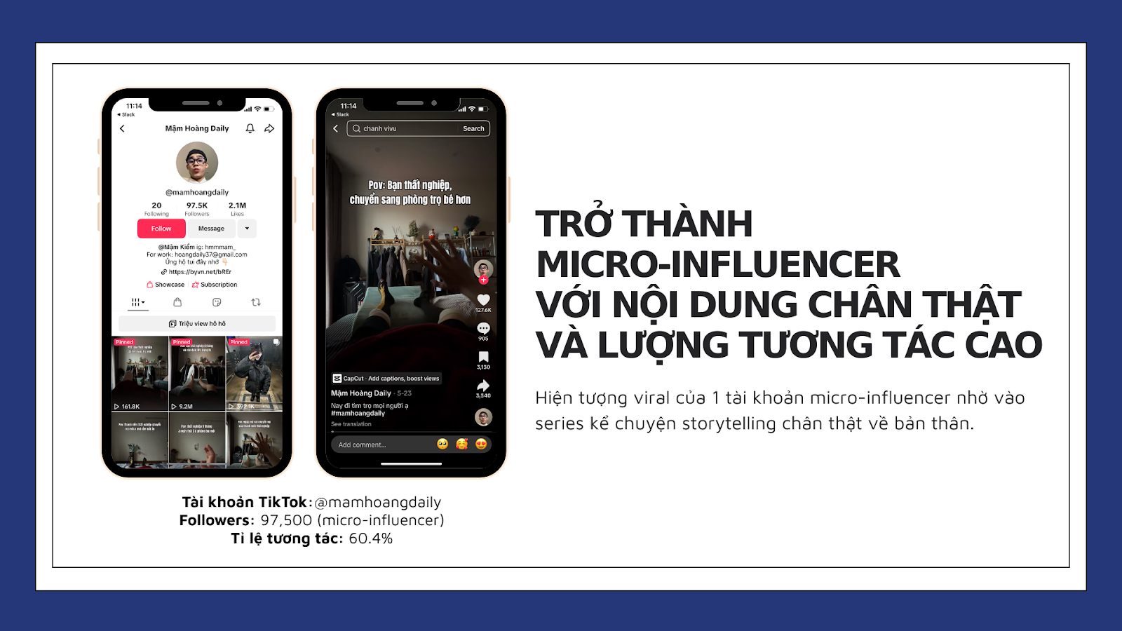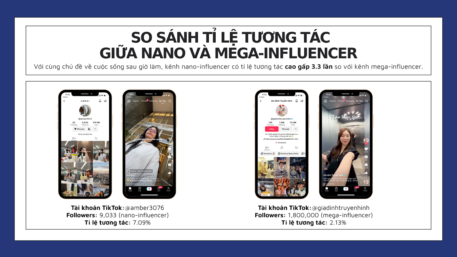 Nội dung chân thật tạo ra tỷ lệ tương tác cao hơn, đặc biệt với nano-influencer, người có tỷ lệ tương tác trung bình đạt 2.53%, cao hơn so với mega-influencer (0.92%). Người tiêu dùng dễ dàng kết nối với những nội dung đời thường, mang dấu ấn cá nhân, như hành trình khám phá, thử thách hay các series kể chuyện.