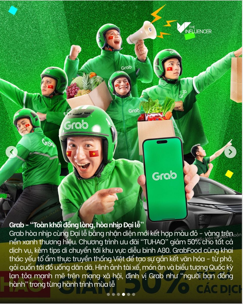 Đặc biệt, GrabFood khai thác yếu tố ẩm thực truyền thống Việt: từ phở, gỏi cuốn đến các món đồ uống dân dã, kết hợp hình ảnh tài xế, món ăn và biểu tượng Quốc kỳ, lan tỏa thông điệp văn hóa trên mạng xã hội. Bên cạnh ưu đãi và tiện ích, Grab còn tổ chức mini game “Khoảnh khắc Tự hào”, trao voucher 200.000 đồng cho người chia sẻ bức ảnh đẹp nhất về ngày lễ. Chiến lược này vừa tăng tương tác online, vừa thúc đẩy trải nghiệm thực tế.